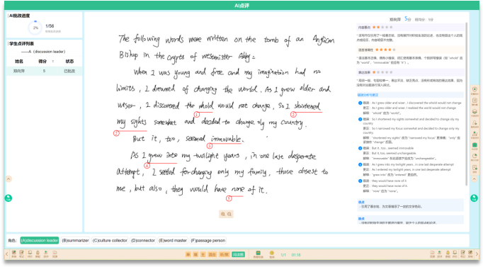 光大纸笔互动课堂除了AI辅助教师精准授课外,还支持多种教学场景应用。以英语阅读课为例,教师采用阅读圈教学时,系统可自动分析学生的讨论结果,评估学生扮演角色的完成情况,并按角色分组呈现供老师参考,辅助教师调整教学策略。
