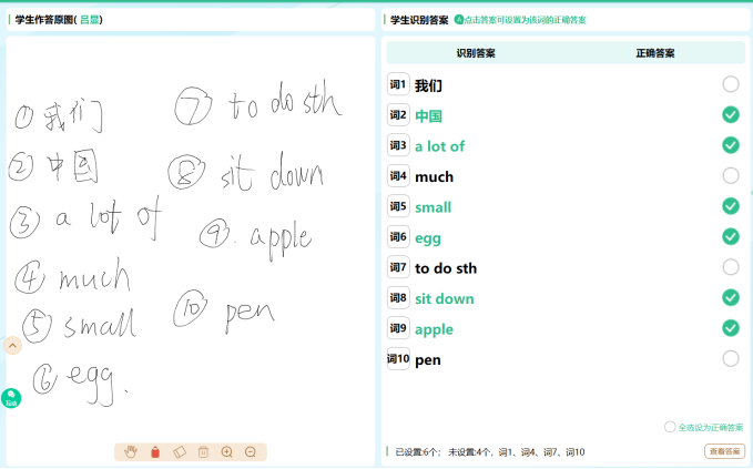 课后巩固环节,学生完成课后作业后,智慧作业系统既支持教师批改作业后,AI识别批阅内容自动登分统分,也支持AI自动批阅作业(部分题型)。教师可以选择自己批改作业后,由系统识别批改痕迹后自动登分统分,也可以选择让智慧作业系统AI批阅作业,最终得到作业讲评报告,直接在课堂授课时讲解。